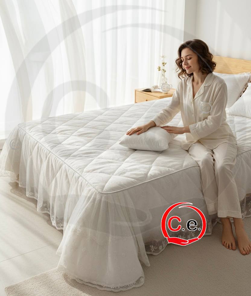 Questa trapunta presenta un tessuto in organza ricamata con 2 cuscini arredo coordinati.